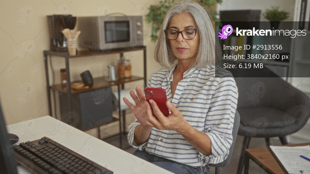 Woman holding smartphone at office desk, tapping screen with hands while seated, glasses on; calm concentration.