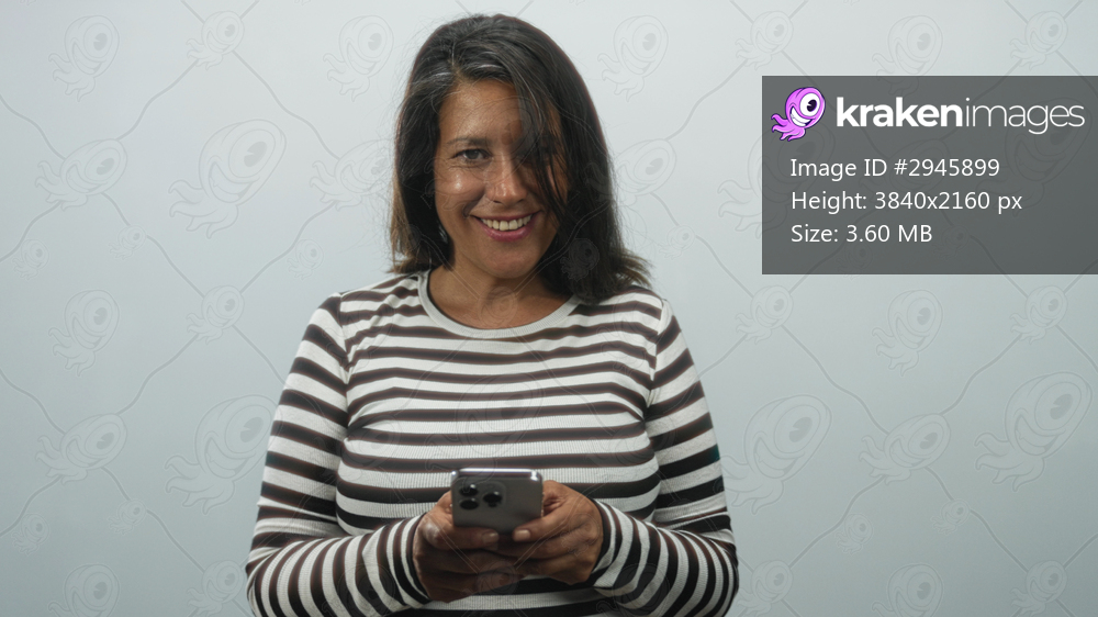 Woman holding smartphone with bare hands, smiling and typing while looking down in studio; digital connection joy.