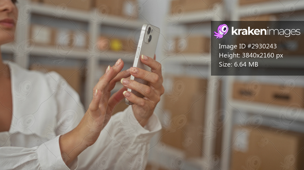 Woman holding smartphone with bare hands and tapping screen in storage building; concentration productivity.