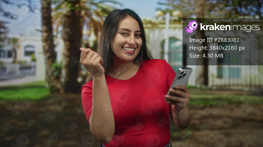 Woman holding smartphone and beckoning with fingers in front of building wearing red top; friendly joy.
