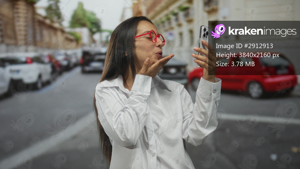 Woman holding smartphone blows a kiss to phone on a city street while smiling and wearing red glasses and white shirt; happiness connection.