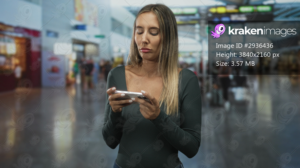 Woman holding smartphone with both hands at airport terminal looking down at screen with a pout; waiting boredom.