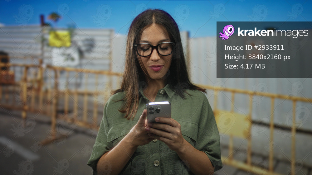 Woman holding smartphone with both hands at building site, glancing at screen and smiling; concentration connection.