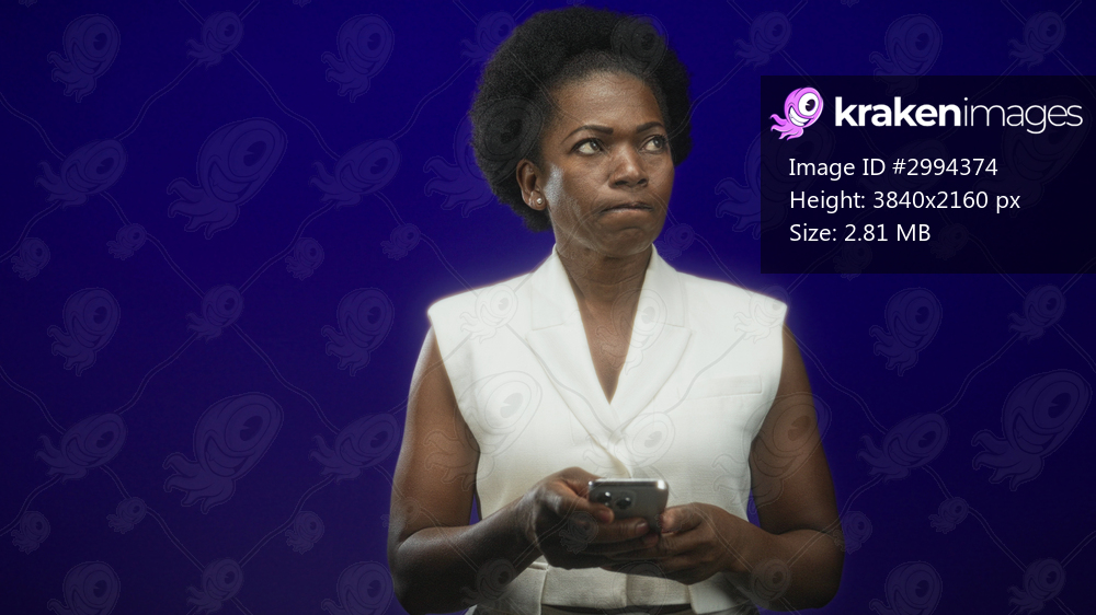 Woman holding smartphone with both hands, looking down at screen with pursed lips against a deep blue studio backdrop, sleeveless white vest; pensive reflection. - Kraken Images