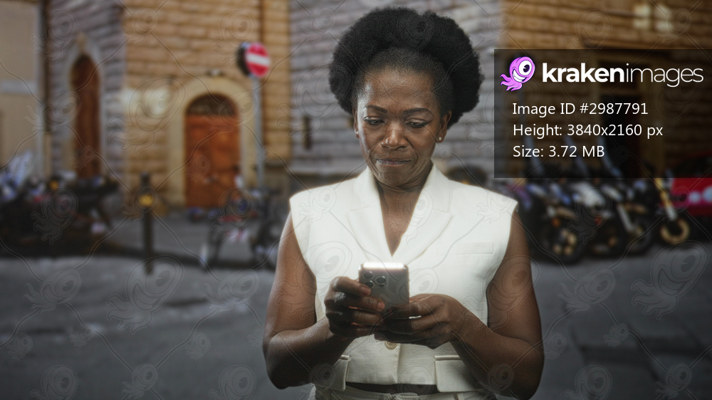 Woman holding smartphone with both hands, looking down on a street near a stone building; quiet concentration.