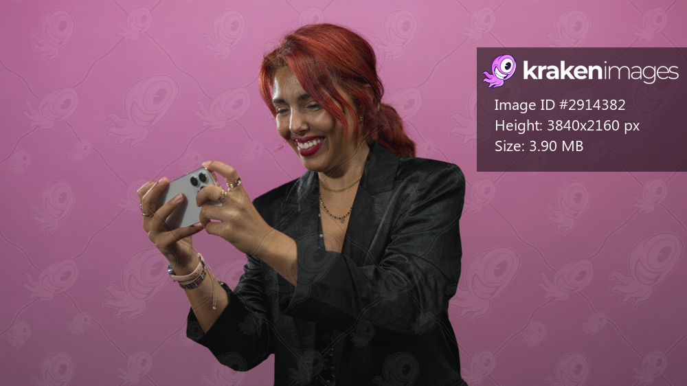 Woman holding smartphone with both hands, smiling and tapping screen in pink studio; happiness connection.