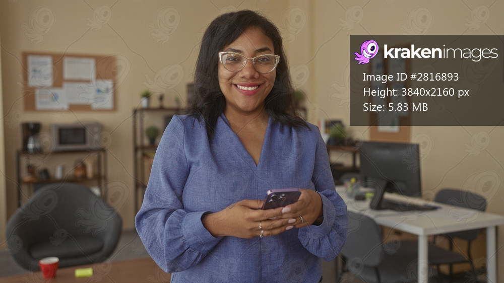 Woman holding smartphone with both hands and tapping screen with fingers at a desk in office building; connection.