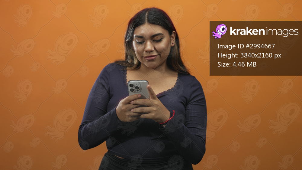 Woman holding smartphone with both hands, thumbs texting and eyes on screen, wearing navy long sleeve top and red bracelet, posed before orange studio wall; concentration. - Kraken Images