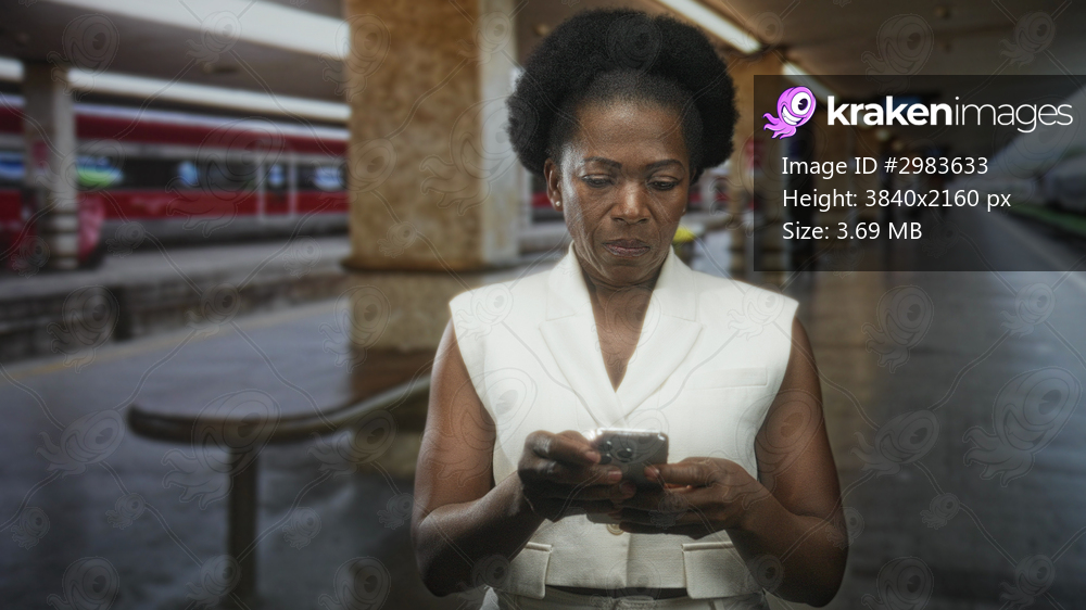 Woman holding smartphone with both hands, thumbs typing text while standing on a train platform in a station building amid benches and a stopped train; focused waiting. - Kraken Images