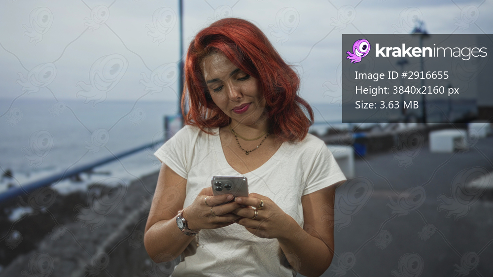 Woman holding smartphone with both hands and typing messages while seated on a seaside promenade bench; concentration.