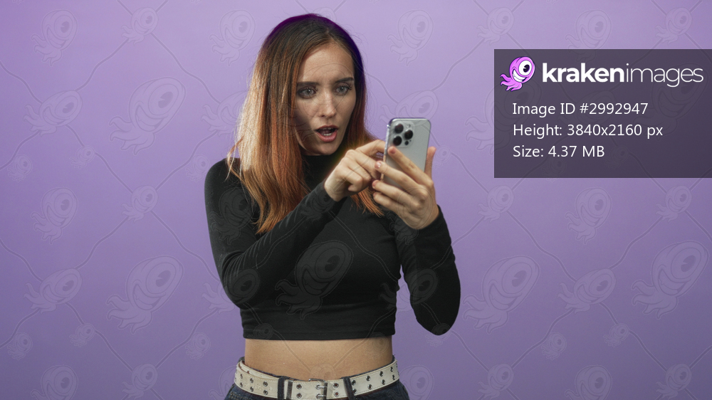 Woman holding smartphone and bringing a closed fist to her mouth while taking a selfie in studio; excitement celebration connection.
