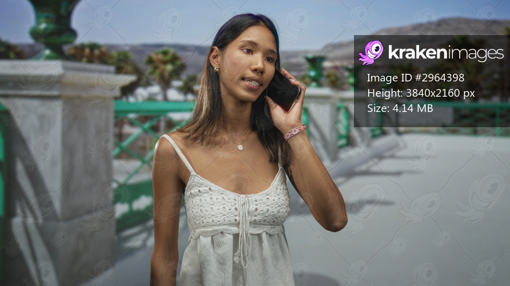 Woman holding smartphone and checking screen with hand near face on street; calm connection contemplation.