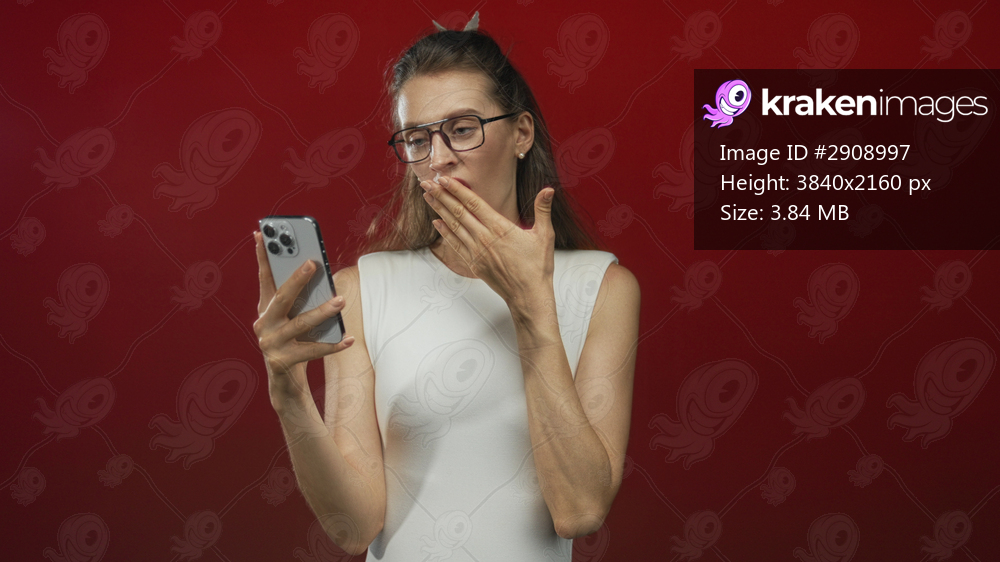 Woman holding smartphone and covering mouth with hand in red studio backdrop, looking at screen while wearing glasses and sleeveless white top; surprise notification. - Kraken Images