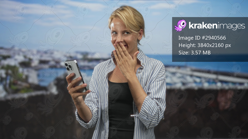 Woman holding smartphone and covering mouth with hand while smiling and reacting to a video or message on a seaside building terrace; surprise connection. - Kraken Images