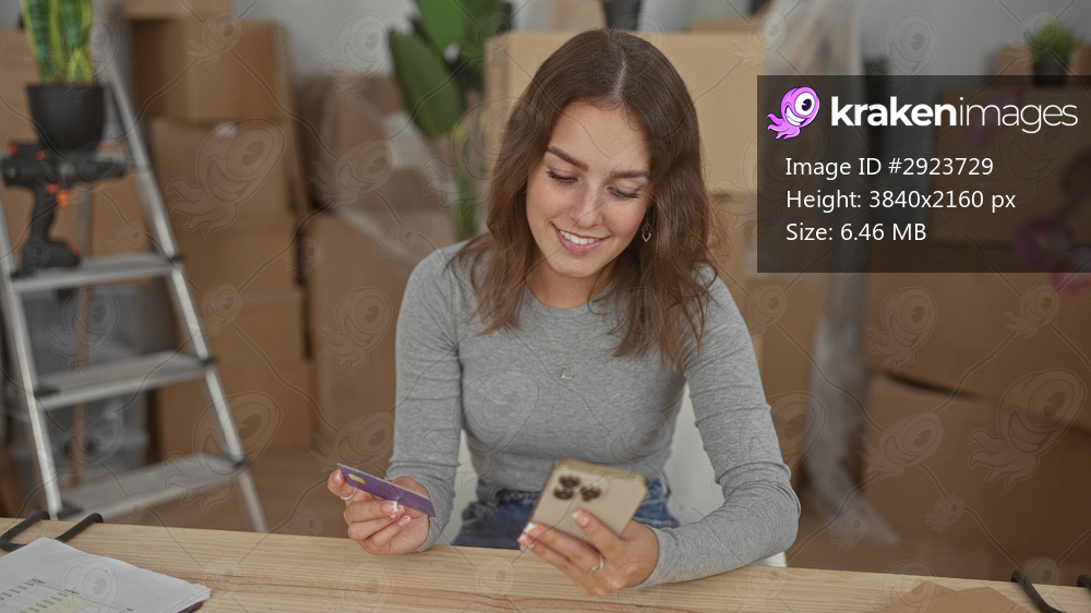 Woman holding smartphone and credit card at a table inside a building surrounded by packed moving boxes and a ladder; focused planning.