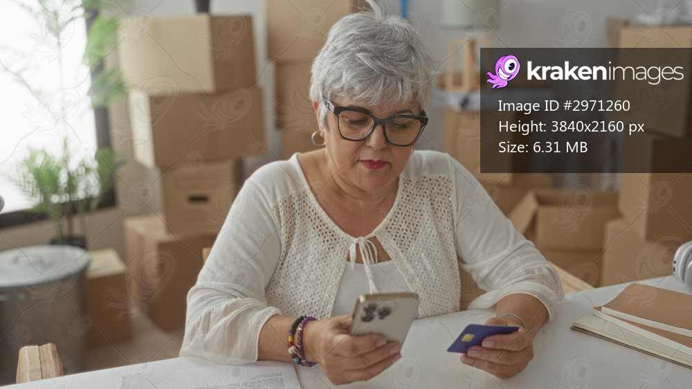 Woman holding smartphone and creditcard with hands at building desk, reviewing documents and cards; financial planning focus.