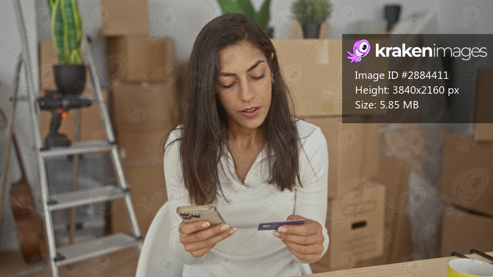 Woman holding smartphone and creditcard with hands visible while sitting among moving boxes in a building; budget planning focused.
