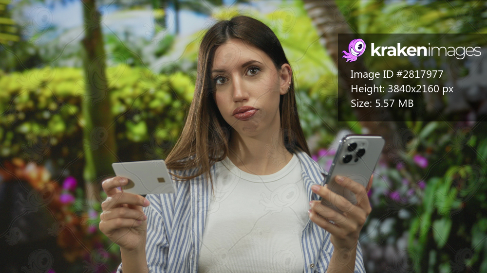 Woman holding smartphone and creditcard in forest with green foliage behind her while checking numbers on screen; uncertainty.