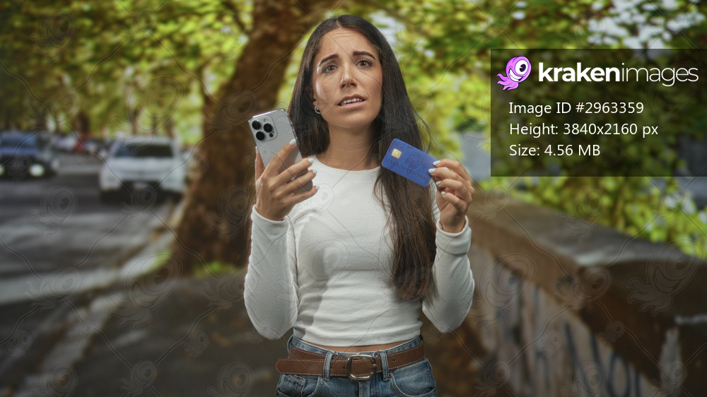 Woman holding smartphone and creditcard in right hand, smiling while looking up on a tree lined street by parked cars and stone wall; joy.