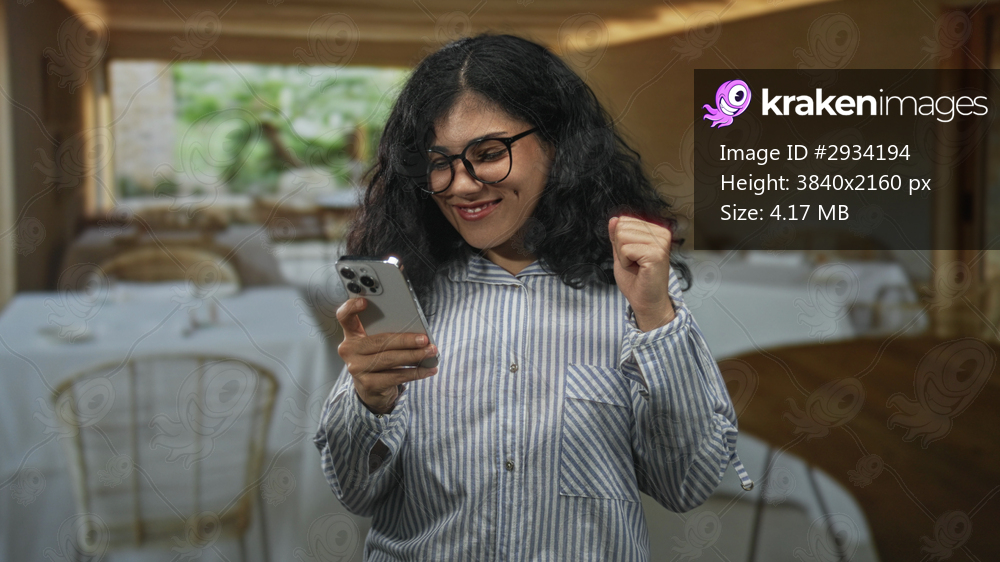 Woman holding smartphone and doing a fist pump while smiling in restaurant indoors; joy celebration.