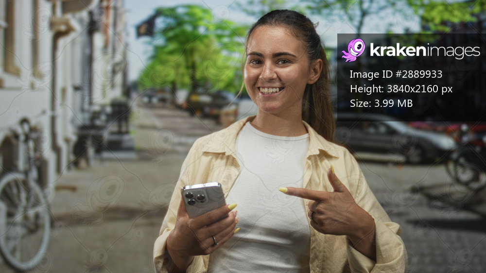 Woman holding smartphone and finger pointing to phone in front of urban street with parked cars and bicycle, smiling at camera; confidence connection.