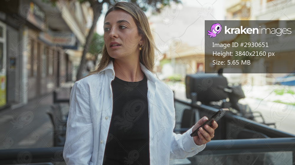 Woman holding smartphone, finger tapping screen on urban street near cafe railing and scooter; contemplation connectivity focus.