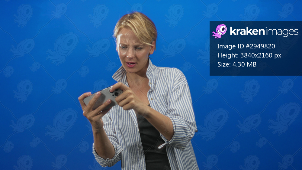 Woman holding smartphone, fingers tapping and angling the device while squinting in studio; frustration focus.