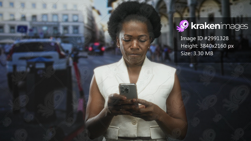 Woman holding smartphone, fingers tapping on screen, middle aged black woman standing on a city street near parked cars and an electric scooter; concentration. - Kraken Images