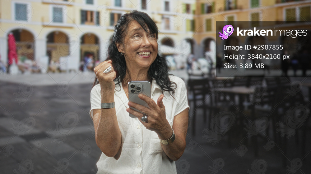Woman holding smartphone with fist pump gesture in building plaza, smiling at screen; joy celebration.