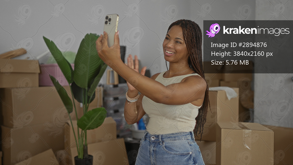 Woman holding smartphone for selfie in new home with moving boxes and houseplant; joy new beginning.