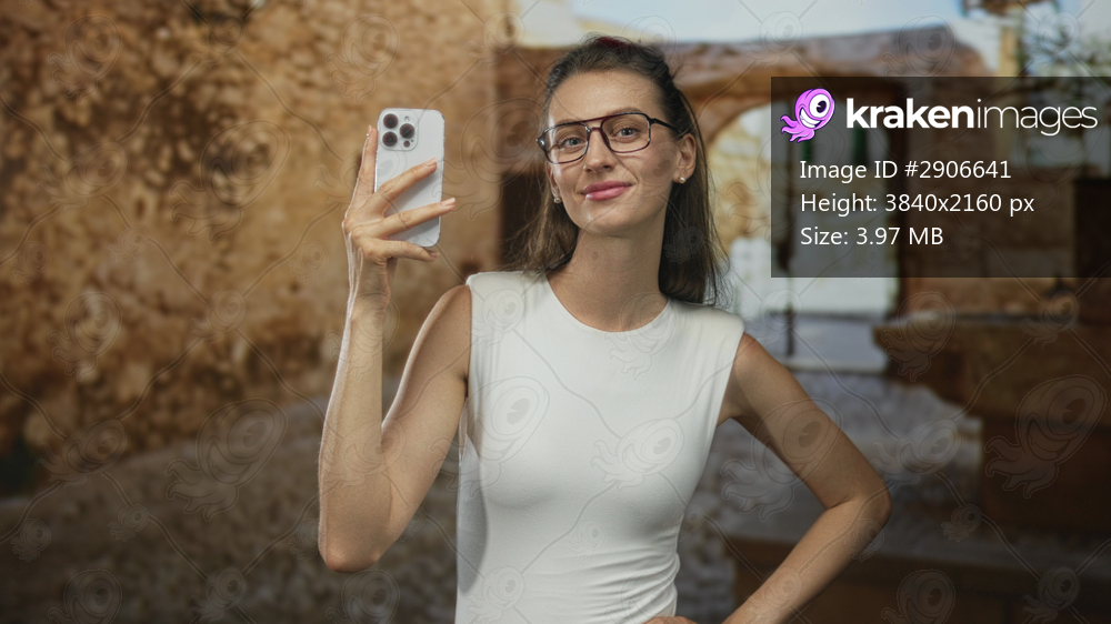 Woman holding smartphone for selfie in old town street with glasses and sleeveless white top showing bare shoulders; confidence self expression.