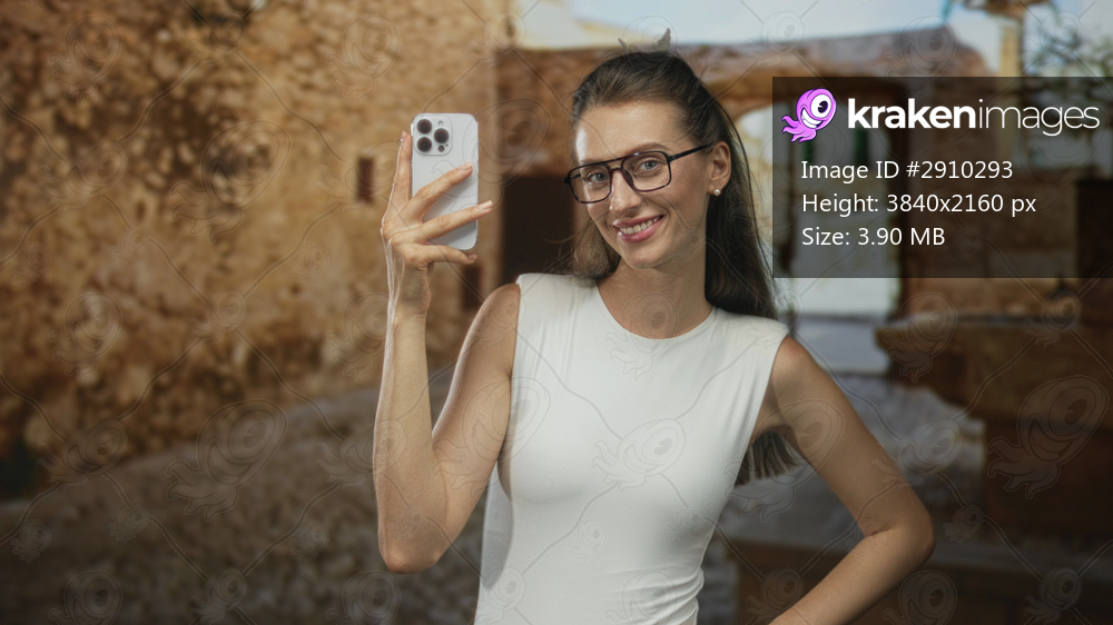 Woman holding smartphone for selfie in old town street with glasses and sleeveless white top showing bare shoulders; confidence self expression.