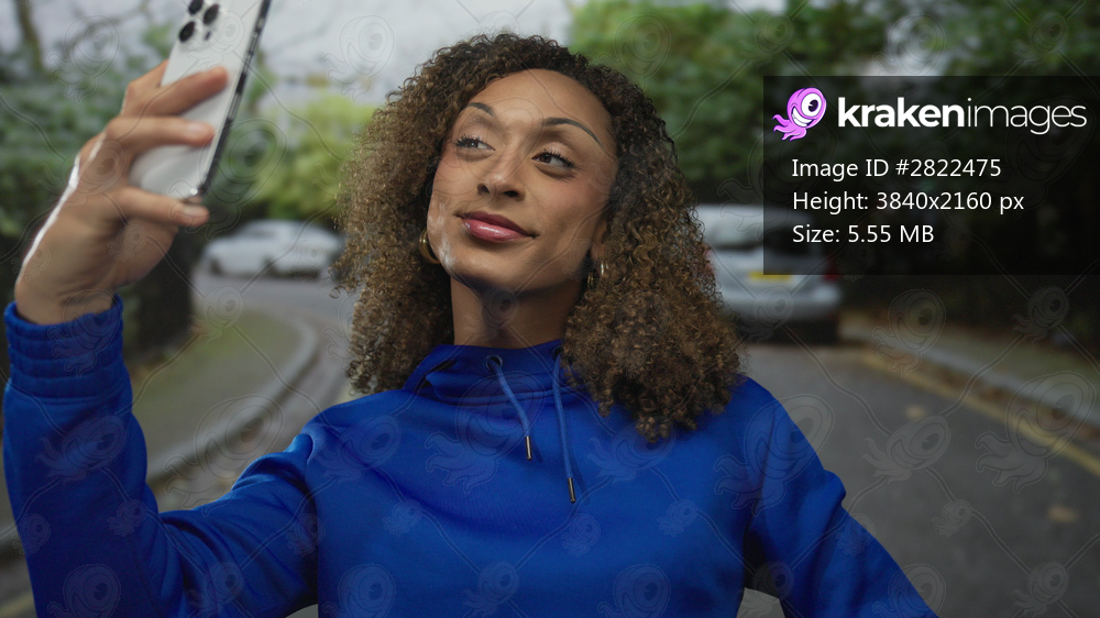 Woman holding smartphone for selfie in sunlit green park with curly hair and blue hoodie; confidence.
