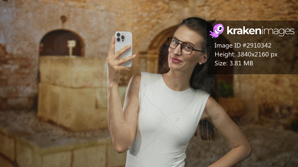 Woman holding smartphone for selfie on old town street near stone arches and fountain wearing sleeveless white top and glasses; confidence travel exploration. - Kraken Images