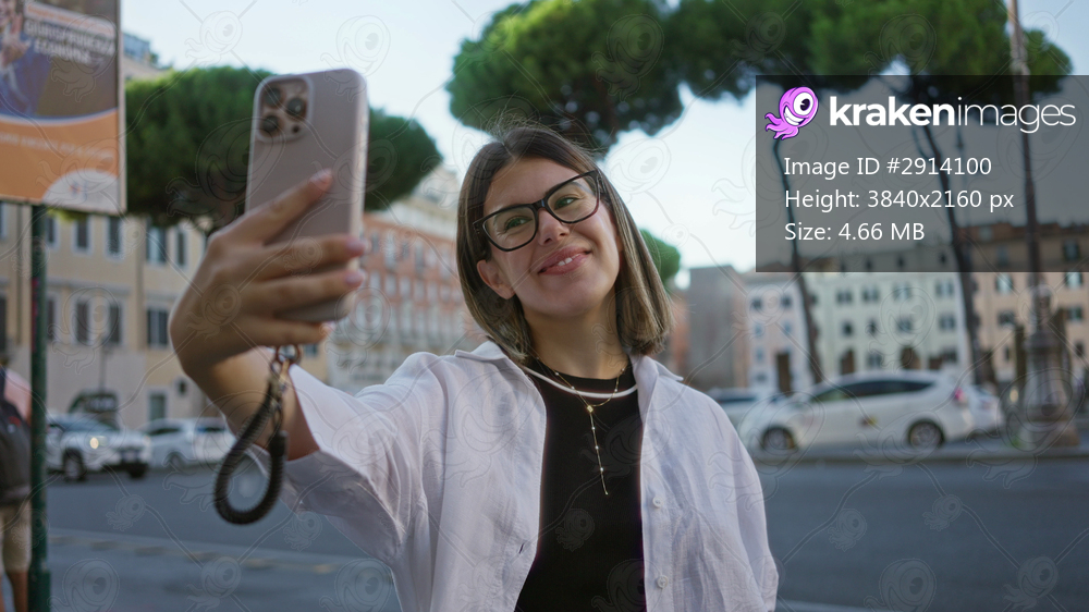 Woman holding smartphone for selfie on rome street, smiling and looking at screen while wearing glasses and white shirt; city joy.