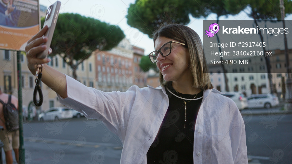 Woman holding smartphone for selfie on rome street, smiling and looking at screen while wearing glasses and white shirt; city joy.