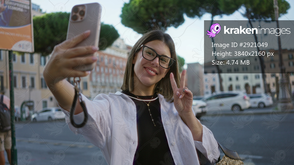 Woman holding smartphone for selfie on rome street, smiling and looking at screen while wearing glasses and white shirt; city joy.