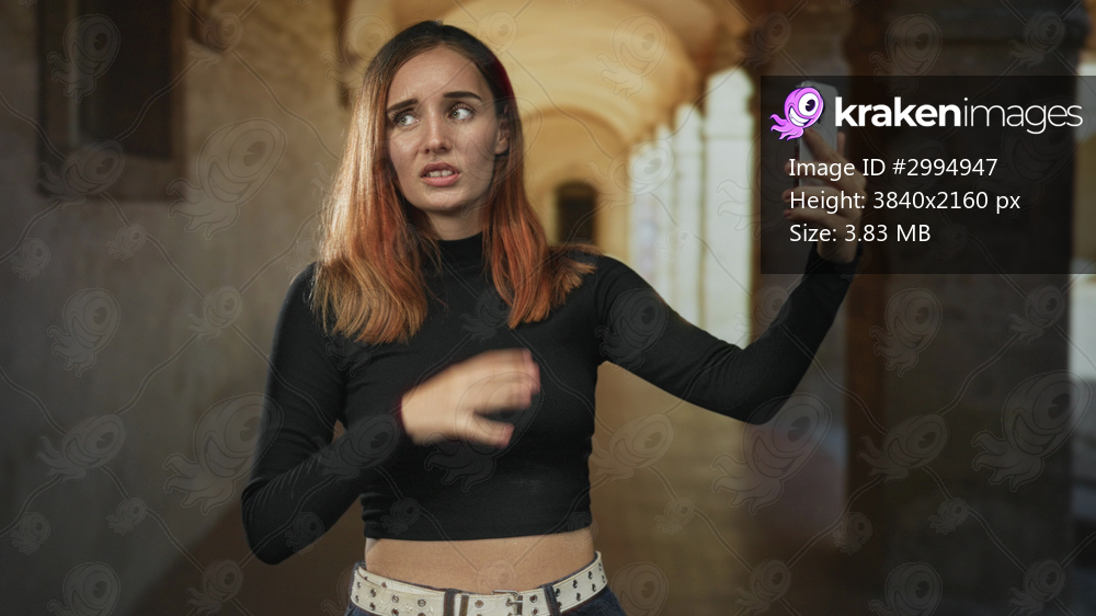 Woman holding smartphone gestures with a shrug and speaks to the device in a building corridor; confusion.