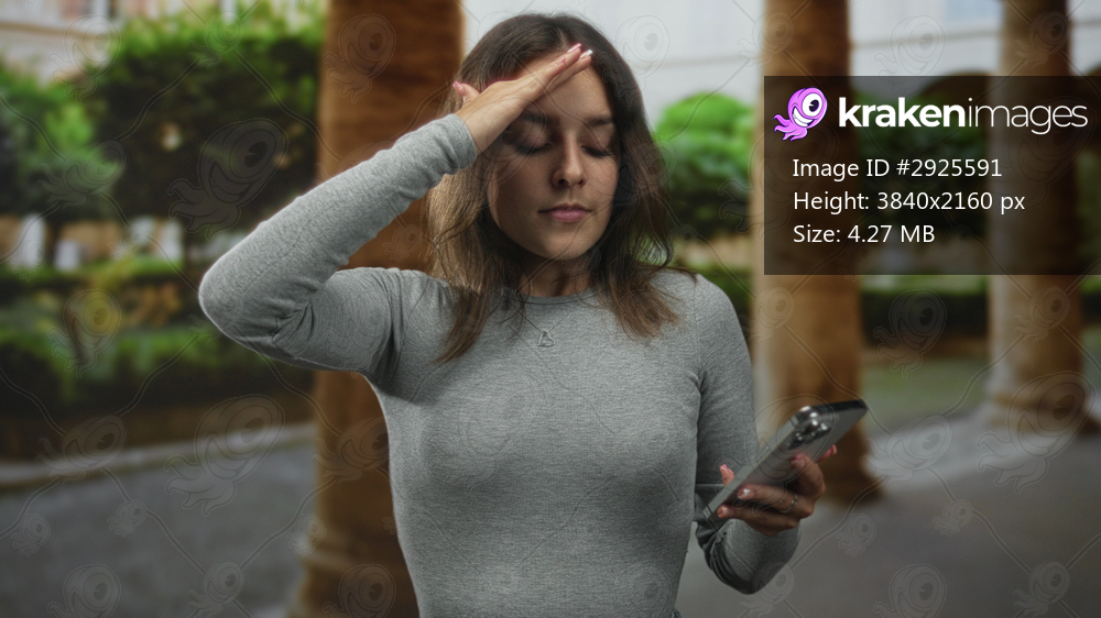 Woman holding smartphone and gesturing with an open hand on an old town street while looking puzzled; concern.