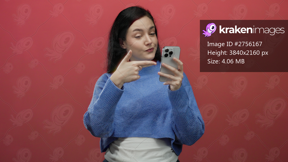 Woman holding smartphone gives thumbs up against red background wearing blue sweater with confident expression symbolizing positivity and connection in a digital setting - Kraken Images
