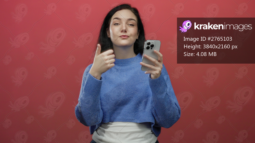 Woman holding smartphone gives thumbs up against red background wearing blue sweater with confident expression symbolizing positivity and connection in a digital setting - Kraken Images