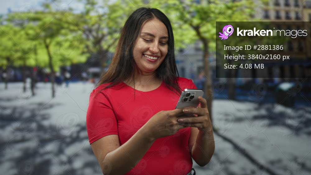 Woman holding smartphone and giving thumbs up in city street near building and trees wearing red shirt, smiling with open mouth; joy celebration.