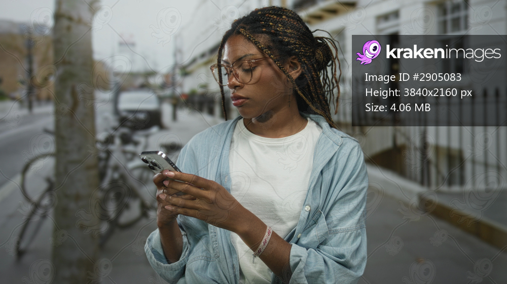 Woman holding smartphone and glancing aside on a city street, denim shirt visible; quiet contemplation.