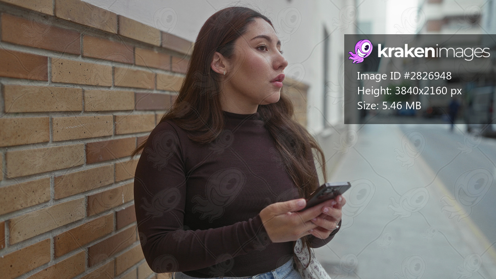 Woman holding smartphone and glancing at screen on street in city with focused posture; thoughtfulness contemplation reflection focus.