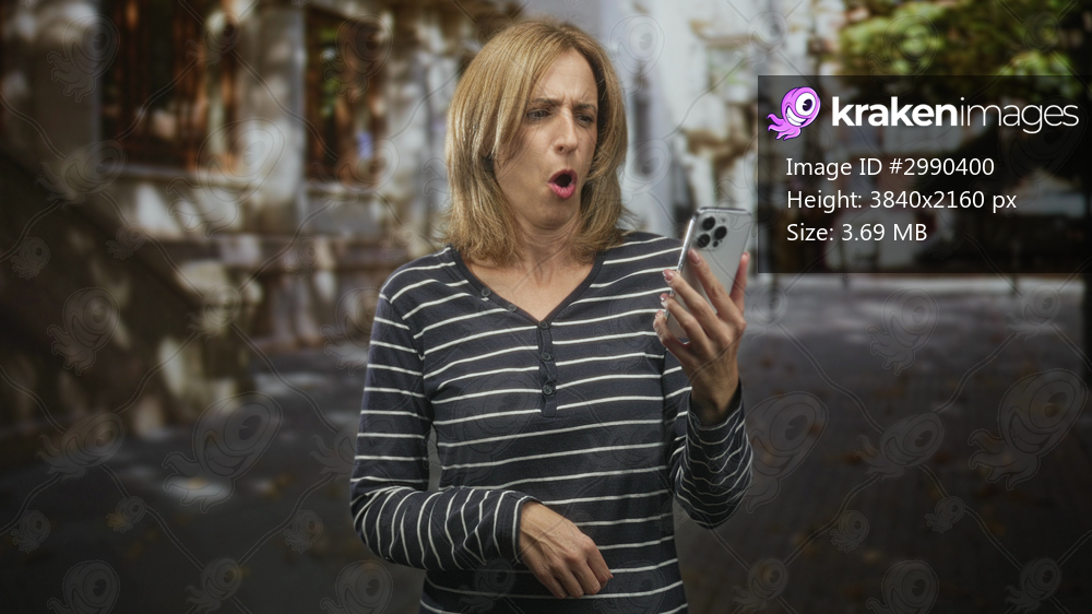 Woman holding smartphone grimaces while looking at the screen on a street lined with buildings and fallen leaves; frustration digital trouble.