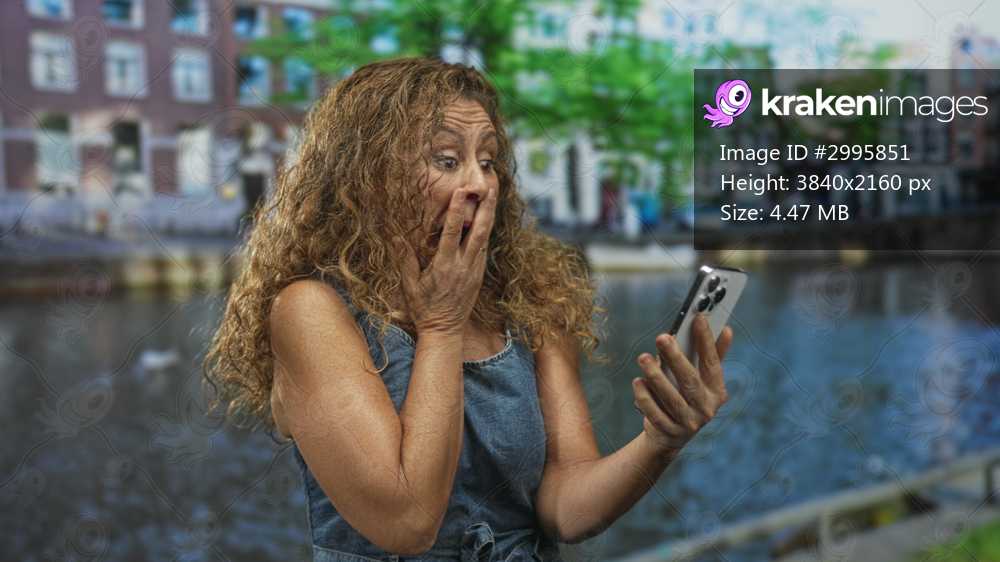 Woman holding smartphone, hand covering mouth in a shocked gesture by canal building with waterfront and row houses in view; surprise curiosity.
