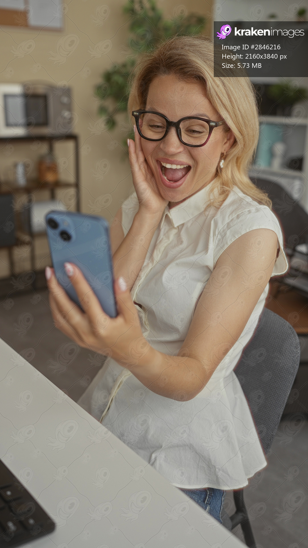 Woman holding smartphone with hand on cheek at desk in bright modern office setting; surprise connection.