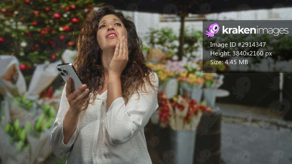 Woman holding smartphone with hand on cheek for toothache in street near flower market; frustration.