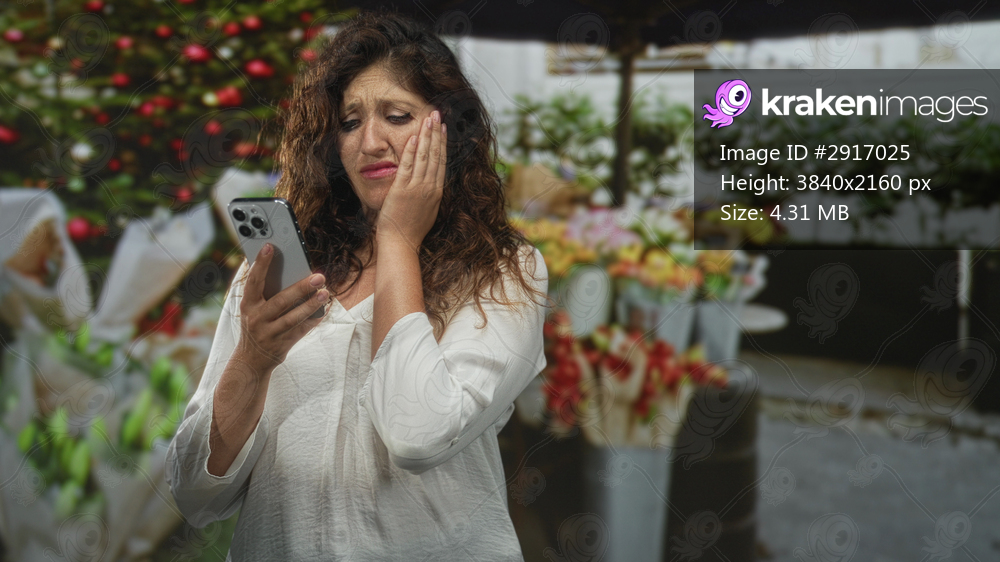 Woman holding smartphone with hand on cheek for toothache in street near flower market; frustration.