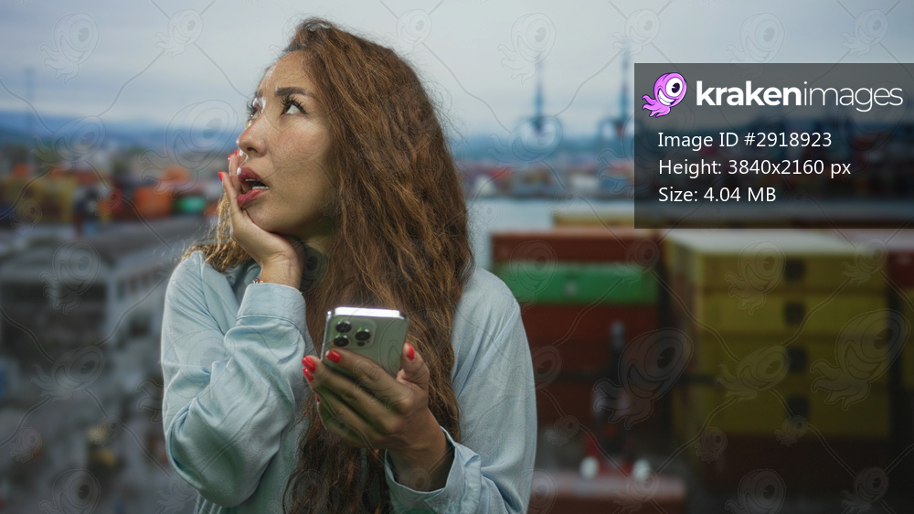Woman holding smartphone, hand on cheek, looking up at port building with shipping containers and cranes; concern.
